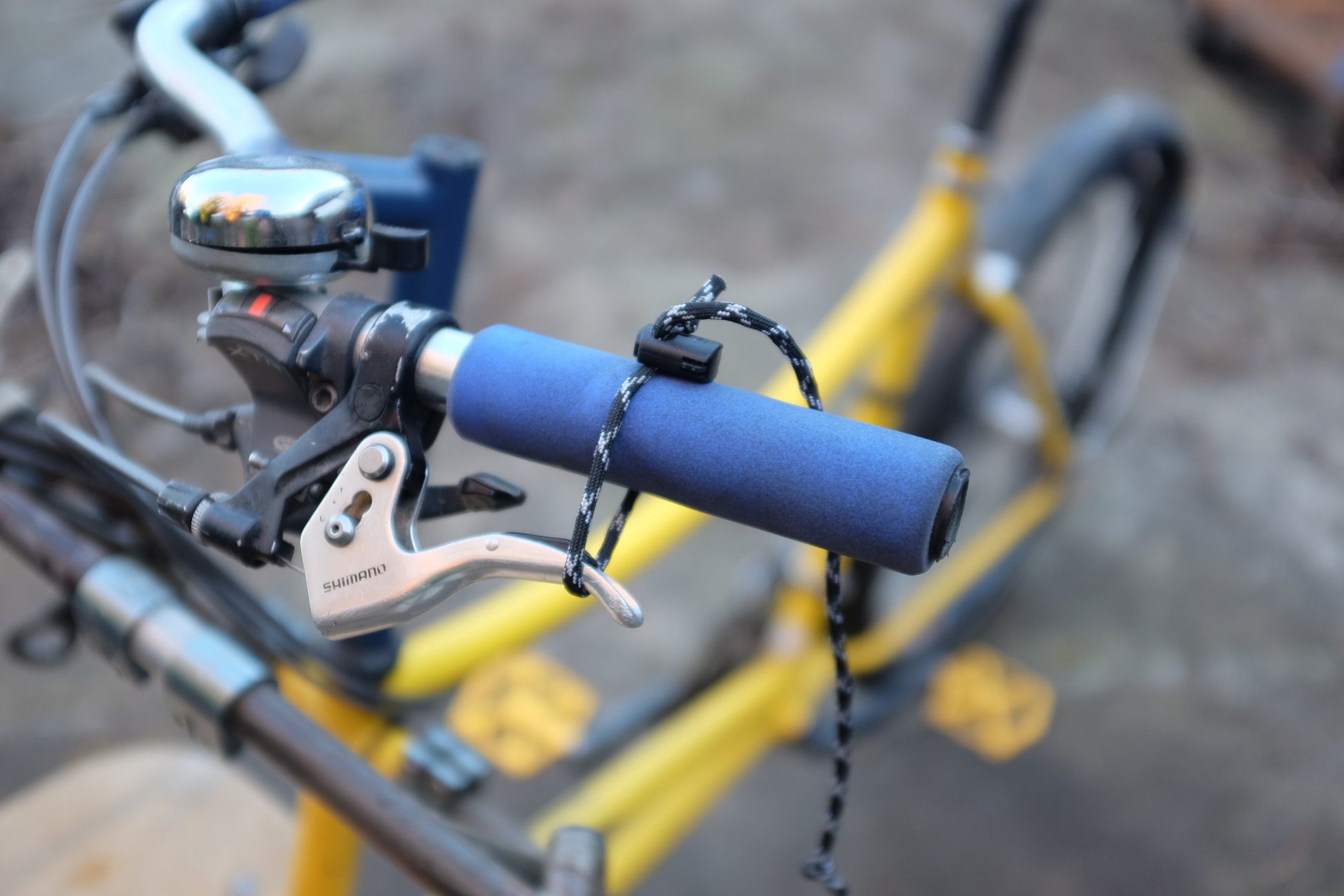This is a super simple parking brake. It was born from traveling on the BART train from SF to Oakland. I was maddening to have to stand next to your bike to stop it from rolling away with every acceleration / deceleration of the train. Post-Bart Brake I was able to read my book in peace. Works great off BART too. Cord is glow-in-the-dark and reflective.